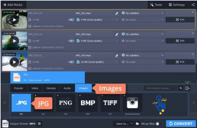 ما عليك سوى تنزيل وتثبيت Movavi Video Editor> إضافة وسائط> إضافة صور> تحديد تنسيق الإخراج> اختر الموقع الذي تريد حفظ الملف المحول فيه> اضغط على زر التحويل!